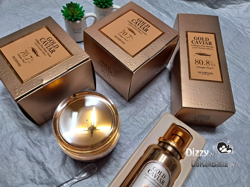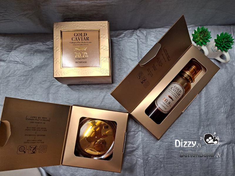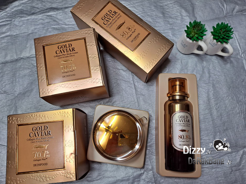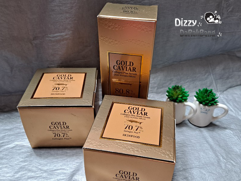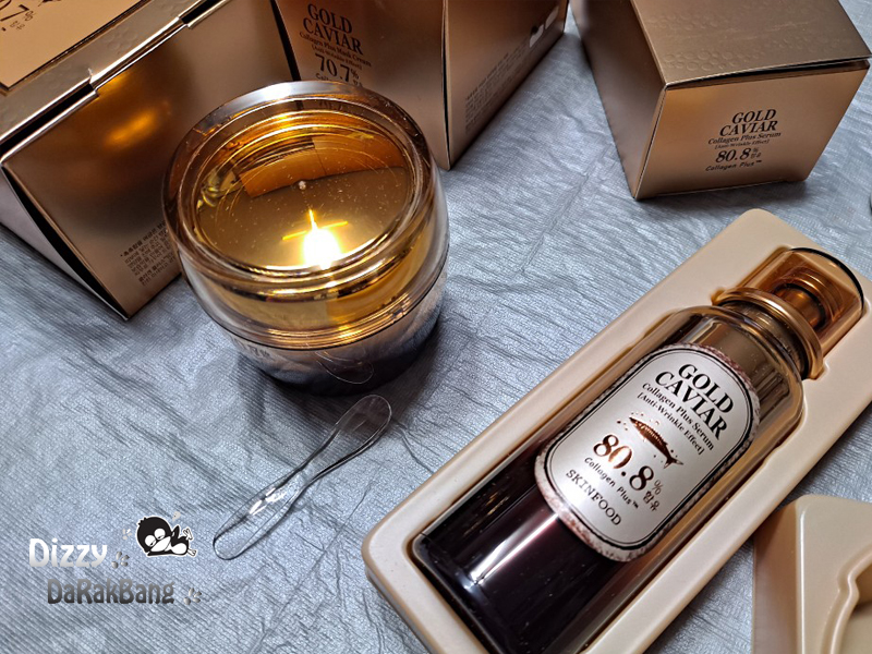 스킨푸드에서 젤루다 높은 가격 제품인 골드 캐비어 콜라겐 플러스 세럼과 마스크 크림
