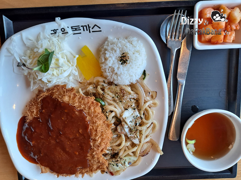 큼지막한 돈까스와 볶음우동이 함께 나오는 구성이다.