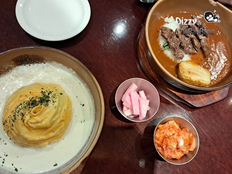 제가 젤로 좋아하는 크림소스 오믈렛과 부채살 스테이크 브라운 카레 주문입니다.