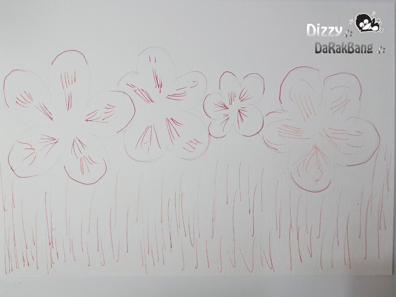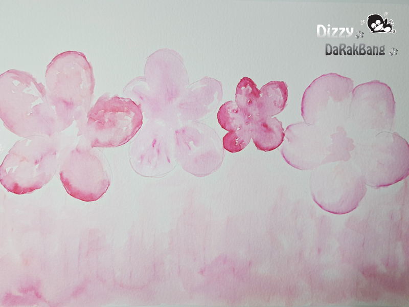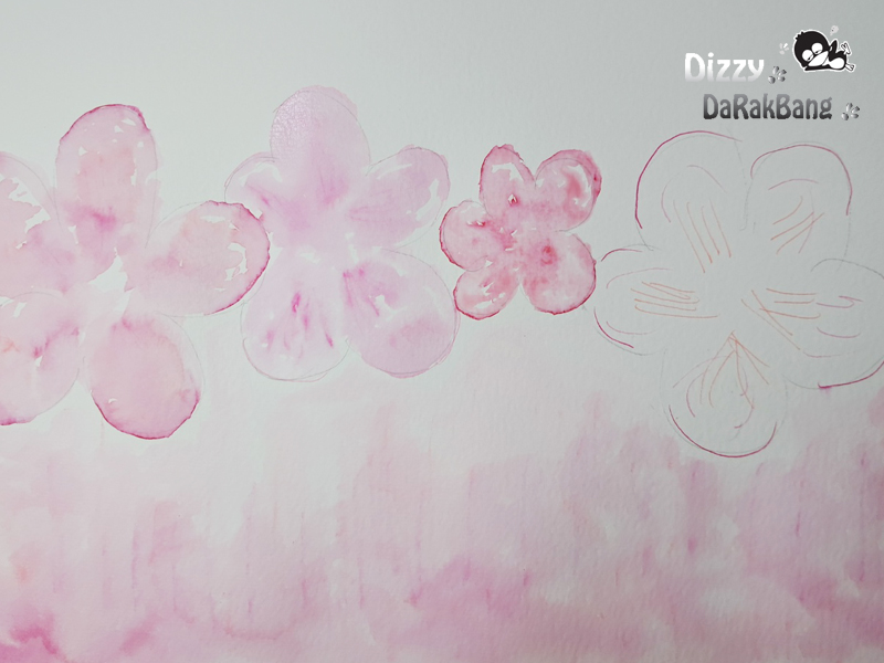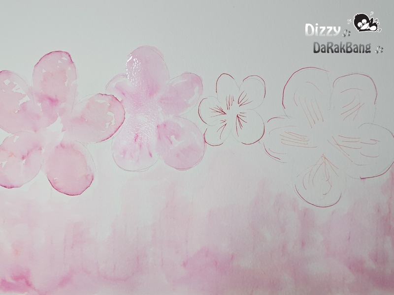 플러스펜으로 그려놓은 꽃 아래 부분을 물붓으로 사르르 칠해주고요